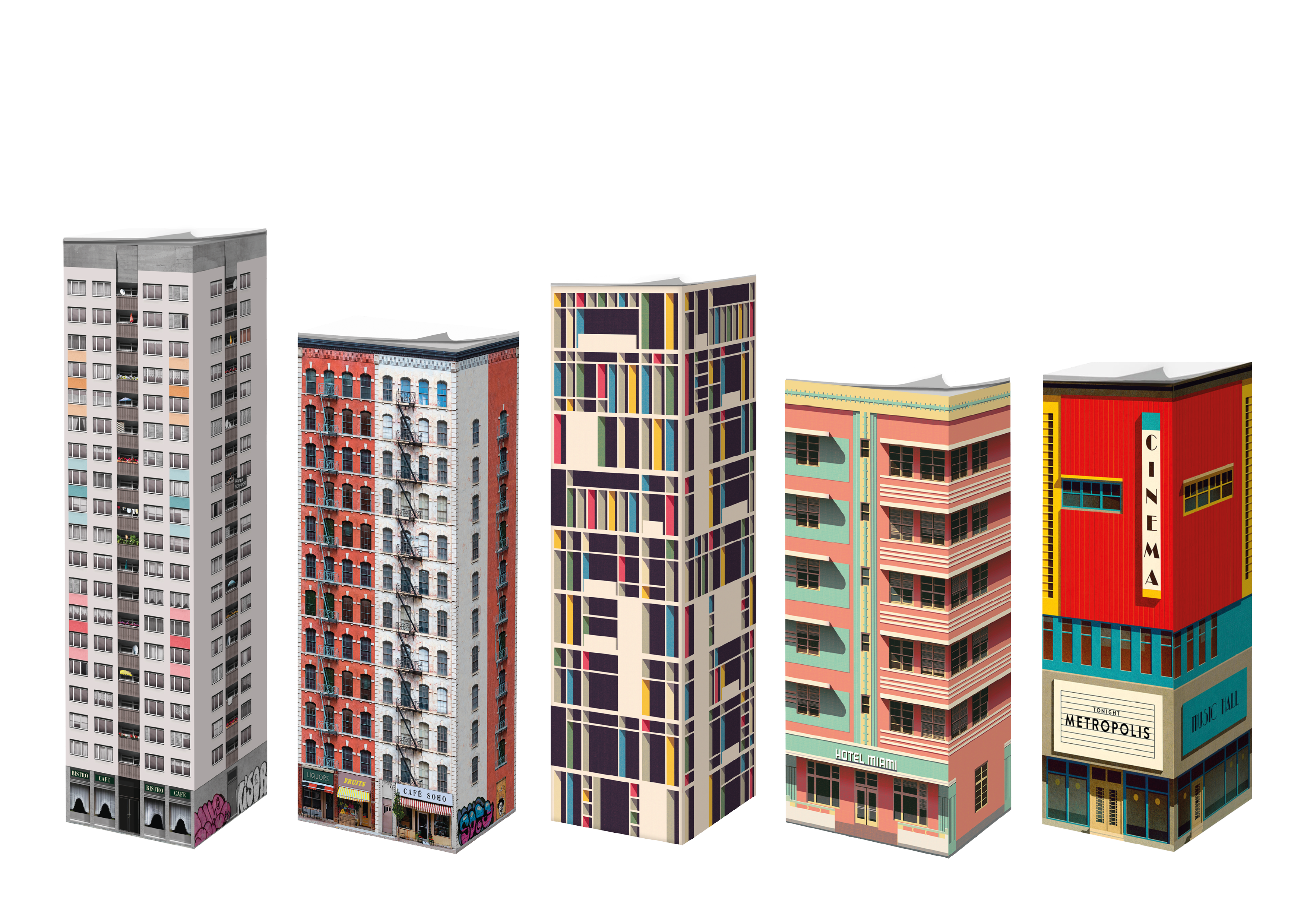 Die Form der Quader prägt zahlreiche ikonische Bauwerke: von Plattenbauten über Stadthäuser und Wolkenkratzer bis hin zum Bauhaus. Genau diese Ikonen der Architektur haben unsere Notizzettelblöcke inspiriert. Frei interpretiert nach realen Vorbildern präsentieren die erste und zweite Edition der Paperscraper® insgesamt sechs beeindruckende Architekturmodelle im Maßstab 1:250.